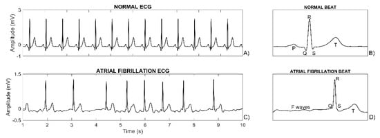 AF is a supraventricular arrhythmia characterized by uncoordinated continuous atrial electrical activation, causing the deterioration of atrial functionality. In normal conditions, the contraction of the heart is initiated by an electrical impulse that, after having been generated by the sino-atrial node, propagates through all atrial myocardial cells, causing their electrical depolarization and mechanical contraction followed by the electrical repolarization and mechanical relaxation. Successively, the electrical impulse reaches the atrioventricular node, in which it is slowly conducted before propagating through all ventricular myocytes, causing their ventricular depolarization and contraction and subsequent repolarization and relaxation. The electrical phenomena associated with the propagation of this impulse through the heart result in typical waves of the electrocardiogram (ECG) measured at the body surface. Normally, the ECG is a pseudo-periodic signal (Figure 1A) constituted by the repetition of a pattern showing a sequence of typical waves (Figure 1B): the P wave, which reflects the atrial depolarization; the QRS complex, which reflects the ventricular depolarization and hides the atrial repolarization; and the T wave, which reflects the ventricular repolarization. In AF, the sino-atrial node is overruled by the continuous fibrillatory activity and is no longer able to provide its pseudo-periodic impulse, so the heart rhythm becomes irregular (Figure 1C) and the impulse propagates though the atria following chaotic pathways [4]. However, once the impulse reaches the atrioventricular node and finds it not refractory, the impulse normally propagates through the ventricles. Combination of the AF random nature and the complex conduction/blocking properties of the atrioventricular node generates an irregular heart rate. These abnormalities of the electrical activity of the heart are reflected in the ECG that is no longer a pseudo-periodic signal but, rather, shows a high level of heart-rate variability (HRV) (Figure 1C). The P wave is no longer present; instead, continuous fibrillatory waves, also called F waves, are seen as rapid low amplitude oscillations that reflect the continuous uncoordinated atrial depolarization (Figure 1D).