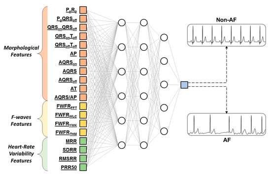 As said, use of ECG features instead of raw data (as sometimes done when using long short-term memory, 1D convolutional neural network and others [11,15,16,33,34]) at the input of RSL_ANN implies adding an ECG processing step for feature extraction before classification; however, it also allows the construction of a faster and simpler artificial neural network, since based on a reduced number of hidden layers, through a smaller training dataset. In addition, since each feature, if well selected, reflects a specific physiologic phenomenon, classification logic of a network is physiologically more understandable than when it is based on raw data, and this is very much appreciated in context in which interpretability of the model is desirable.