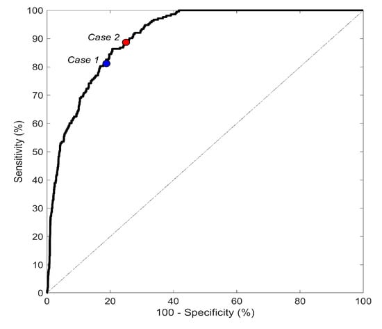 Receiving operating characteristic (ROC) for the testing dataset. The area under the curve (AUC) value is 90.8%. Operating points for Case 1 (blue dot), in which sensitivity (Se) and specificity (Sp) are both equal to 81.2%, and Case 2 (red dot), in which Sp is 75% and Se is 88.7%, are also reported.