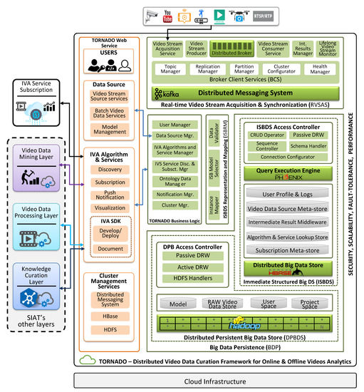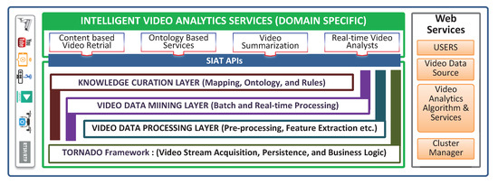 Recently, the deployment of distributed computing technologies in the cloud for video big data analytics has been the center of attraction in academics and industry. In the literature, some efforts have been made to propose a Cloud-based Video Analytics System (CVAS) for online and offline IVA, for example, [9,10,11]. The focus of these studies is more on video analytics (value extraction) and overlook the data curation issues encompassing value, volume, velocity, and variety management throughout the lifecycle of IVA in the cloud. Data curation is the active management of data over its life cycle, from creation, acquisition, and initial storage to the time when it is archived or becomes obsolete [12]. Industrial CVAS, such as Checkvideo [13], Intelli-Vision [14], assist consumers with limited functionalities, i.e., real-time IVA service subscription. Google released a cloud-based video intelligence API to generate video metadata [15] and provided it as a black box to the developer. It does not allow the developer/researcher to plug new IVA algorithms or to extend its functionality. Likewise, the understanding, configuration, and operationalization of big data technologies for IVA in the cloud are tedious and time-consuming, especially in an educational environment. Furthermore, the IVA lifecycle in the cloud spin around IVA approaches. The existing solutions also do not consider factors like the management of high-level and low-level features while deploying IVA algorithms. Motivated by these limitations in existing work, we propose and implement a comprehensive intermediate results orchestration based service-oriented data curation framework for large-scale online and offline IVA in the cloud known as TORNADO.