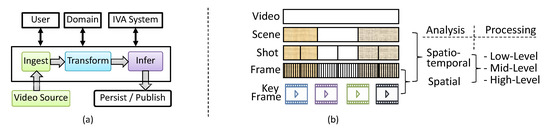 The process of IVA undergoes different phases, as shown in Figure 2a. The Video Source are the sources that either generate video streams from sources connected directly to real-world domains such as IP-camera or can be already acquired videos in the form of datasets. IVA in the cloud are performed either on the video streams or on video datasets and is referred as Real-time IVA (RIVA) and Batch IVA (BIVA), respectively. In the context of IVA, a video can be represented in a hierarchy, as shown in Figure 2b. A given video may be decomposed into its constituent units either in the temporal or spatial domain. We call mini-batch to a group of frames with respect to time that belongs to a Video Source. The size of the mini-batch is dependent on the contextual IVA analysis. Such constituent units are further subject to low, mid, or/and high-level processing. In the low-level processing, primitive operations are performed, for example, noise reduction and histogram equalizer, where the input and output are a sequence of frames. The mid-level processing extracts features from the sequence of frames, for example, segmentation, description, classification. The high-level processing makes sense of an ensemble of recognized objects, and perform the cognitive functions normally associated with vision.