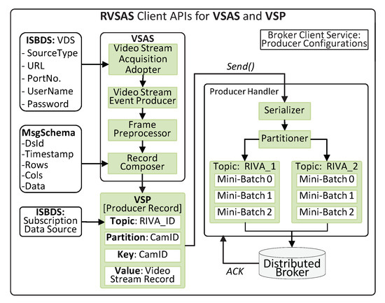 VSAS are client APIs and can be configured on the Producer Cluster to acquire large-scale video stream. VSAS is composed of four sub-modules, i.e., Video Stream Acquisition Adaptor, Video Stream Event Producer, Frame Detector and Preprocessor, and Record Composed. The Video Stream Acquisition Adaptor provides interfaces for device independent video stream sources. If a particular video source is subscribed against a RIVA service, then the Stream Acquisition Service gets the configuration metadata from the Video Data Source DS in ISBDS and configure the source device for video streaming. Then the Video Stream Event Producer decodes the video stream, detects the frames, and forwards to the Frame Preprocessor for meta-data extraction and frame resizing. To communicate with the video stream source, a JavaScript Object Notation (JSON) object is defined. The contents of this object consist of five fields, i.e., data source id, number of columns and number of rows in a frame, the timestamp of the data origination at a data source and payload. This JSON object is known as Record, which is then forwarded to the Producer Handler, as illustrated in Figure 4.
