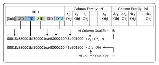 IRID Design: The IR Middleware persists the extracted IR over time from videos. It has been optimized to support DateTime granularity-based queries of IR. This is accomplished through careful design of the row-key called , as shown in Figure 7 in hex-encoded form. HBase store rows ordered by row-key, so the entire history for a single source is persisted as adjacent rows. Within the run of rows for a user, they are ordered by timestamp. The are byte arrays comprised of the combination of . The , and are monotonically increasing unique identifiers, which represent an instance of a user, video source, algorithms, and services, respectively. In the , the is a downsampled timestamp. When is prefixed by an optional salt to distribute data across multiple regions better, then it is called . In cryptography, a salt is random data that is utilized as an additional input to a one-way function to secure data [36]. Here our aim is not security but to generate a random hash value from an arbitrary argument. The timestamp is a Unix epoch four bytes encoded value in seconds. Rows are broken up into hour increments, reflected by the timestamp in each row. Thus, each timestamp will be downsampled to an hour value. This is to avoid stuffing too many IR in a single row as that would affect region distribution. Also, since HBase sorts on the row-key, data for the same user and time bucket, but either with different algorithms or services are grouped for efficient queries.