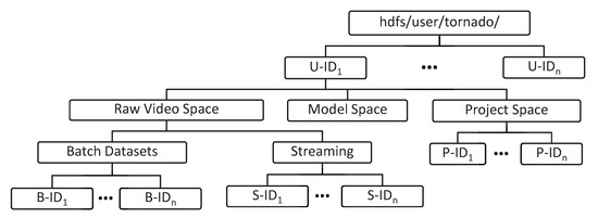 The DPBDS component built on the top of HDFS and is responsible for providing permanent and distributed big-data storage. The data are stored and mapped systematically according to the business logic of the proposed system. The DPBDS component is designed to effectively and dynamically manage the data workload in the life cycle of IVA algorithms. Upon new registration with the TORNADO, a formal User Space is created on the top of HDFS. The User Space is managed through a proper hierarchical directory structure, and special read and write access is granted to the owner. All the directories are synchronized and mapped according to the user identification in the user profile logs. In HDFS, under each User Space three types of distributed directories are created, i.e., Raw Video Space, Model Space, and Project Space, as shown in Figure 9.