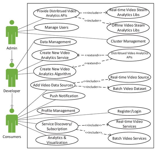 In literature, there are some more studies in which efforts are made to resolve CVAS related issues. Pereira, R. et al. [23] was motivated by the fact that digital video compression is crucial for storage in the cloud and transmission. In this context, they proposed a cloud-based distributed architecture for video compression based on the Split-Merge technique while using the MapReduce framework. Liu et al. [24] used distributed technologies, i.e., Hadoop and MapReduce, for video sharing and transcoding purposes. Likewise, Lin, C.-F. et al. [25] implemented a prototype of a cloud-based video recorder system. A CVAS was proposed by Ananthanarayanan et al. [26,27] called Killer App to meet the real-time demands of video analytics and to address latency, bandwidth, and provisioning challenges. Furthermore, various leading industrial CVAS have successfully been deployed, and they allow the consumers a service subscription. Some organizations provide real-time video analytics for security, while others to extract metadata from video contents with the aim of indexing and searching. Some of the popular real-time video stream analytics service providers are Check Video [13], Eagle Eye Networks [28], and Intelli-Version [14]. These companies provide cloud-based real-time video analytics services. However, they did not offer video analytics APIs aaS to the developers and researchers to build and deploy new video analytics algorithms and services. Recently, Google released a cloud-based video intelligence API to generate video metadata [15] and provided it as a black box to the developer. These systems are developed for commercial use and do not allow developers and scientists to create new video data mining algorithms and services.