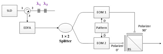 Figure 1 illustrates the design of the proposed FBG encoder with the M-sequence for which N = 3. The proposed encoder comprises a superluminescent diode (SLD) light source, an optical circulator, a series of FBGs, a 1 × 2 optical splitter, a pattern generator, two polarizers (0° and 90°), a beam splitter (BS), and two EOMs for bipolar coding. First, an SLD output is inserted into Port 1 of the optical circulator and then used as an input for the series of FBGs through Port 2 of the optical circulator. Subsequently, the series of FBGs is employed to reflect specific wavelengths according to the codeword assigned using the M-sequence. For example, when N = 3, the FBG resonance wavelengths are λ1 and λ3, corresponding to codeword X1 = [1 0 1] for the first user.