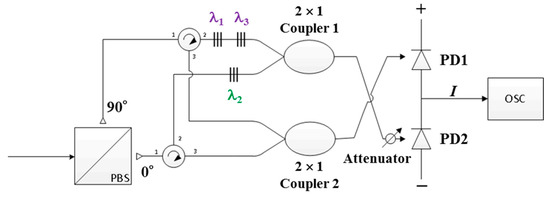 First, the optical signals received from the collimator output are depolarized through the PBS and then used as input for the first ports of two circulators. The received optical signals with vertical and horizontal polarization components appear in the upper arm and lower branch paths, respectively. The two ports of the two optical circulators are connected to the two series of FBGs, which correspond to the normal (X) and complementary ( X ¯ ) codewords. For example, when N = 3, the series of upper FBGs reflects the central wavelengths of λ1 and λ3 that correspond to the normal codeword X1 = [1 0 1] in FBG Decoder 1. Similarly, the second series of FBGs reflects the central wavelength of λ2, which corresponds to the complementary codeword X ¯ 1 = [0 1 0] in FBG Decoder 1. The output signals of the two series of FBGs are coupled into the upper 2 × 1 optical coupler. The lower optical coupler is used to collect optical signals from Port 3 of each of two optical circulators. The output signal received from the upper coupler passes through the attenuator and arrives at the second input port of the BPD. The purpose of this process is to alleviate the influence of unwanted spectral outputs caused by imperfect reflections in the FBG decoder. The output signal of the lower coupler is used as an input to the first input port of the BPD. On the basis of Equations (2) and (3), we developed two models for the outputs of the upper and lower couplers of FBG Decoder 1, namely F11 and F21, when the codeword of Xj is received, expressed as