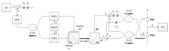 On the basis of the structure illustrated in Figure 3 with N = 3, the feasibility of the proposed FSO communication system was verified through several experiments by using a model with the following specifications: (1) for the light source, the NXTAR SLD-2000 was adopted. (2) Couplers (Fiber Optic Communications, Inc., Hsinchu, Taiwan) were used as 1 × 2 splitters and 2 × 1 couplers. (3) A Pirelli 10-Gbps integrated optic intensity modulator—which used two EOMs—was used to modulate the signal of the pattern output. (4) An Agilent 81130A pulse pattern generator was used to generate desired patterns for transmission. (5) A left-handed plastic circular polarizer (CP42HE) 12.5 mm in diameter—which used two polarizers (0° and 90°)—was used to assign the light signal to the specific polarization state. (6) A 25-mm nonpolarizing cube BS with a wavelength range of 1100–1620 nm was used to combine optical signals from different paths. (7) A 5-mm VIS polarizing cube BS was used to split two polarization states (0° and 90°) from the input optical signal. (8) A single-mode circulator (1550 nm and 500 mW; FCIR-1550-3-3-A-0-1-2-1-2) was used as the optical circulator. (9) The attenuator range was adjusted from 0 to −30 dB to alleviate the influences of noise and the lower branch signal in the front of PD2. (10) The BPD (Model-1817, New Focus Inc., USA) was used for optical signal subtraction and the conversion of the results into electrical signals. (11) A Tektronix oscilloscope (OSC, model TDS2102B) was used to monitor BPD outputs. (12) A limited power supply of 15 V was provided to the BPD. (13) An Anritsu MS9710C optical spectrum analyzer was employed to assess the accuracy of the spectral output acquired from a codec.