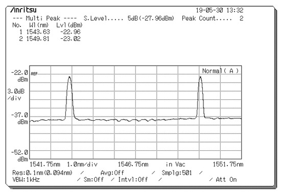 Figure 4 presents the measured reflected spectra (λ1, λ3) for user 1 with corresponding central wavelengths of 1543 and 1549 nm and light intensities of −22.96 and −23.02 dBm, which appeared at the circulator port in Encoder 1. After the reflected spectra passed through the EDFA and 1 × 2 splitter, they were modulated by EOMs 1 and 2 according to the normal (D) and complementary ( D ¯ ) outputs of the pattern generator, and the spectra were then entered as inputs that were parallel to the input ports of the two polarizers (90° and 0°) to determine suitable polarization states.