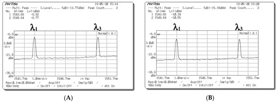 Figure 5. Output spectrum acquired at the output ports of the two electro-optical modulators (EOMs) for different data bits. (A) Optical spectra of EOM 1 for a data bit of “1”. (B) Optical spectra of EOM 2 for a data bit of “0”.