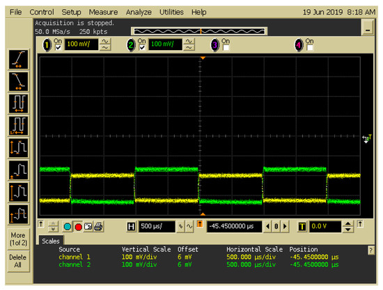 Figure 6. Input signals of the two electro-optical modulators (EOMs) when the signals of Channels 1 and 2 were entered as inputs into EOM 1 and EOM 2, respectively.