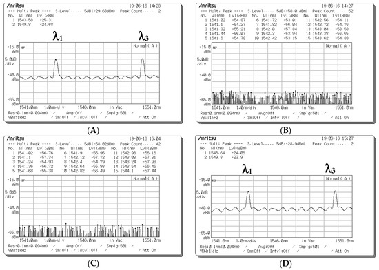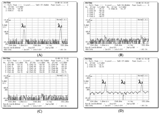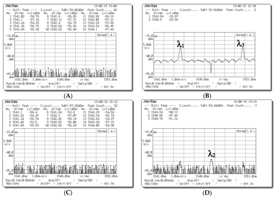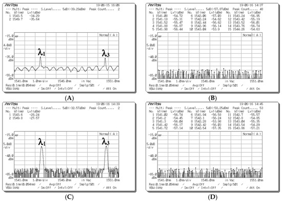 Figure 8. Optical spectrum before the optical signals entered upper and lower couplers when a data bit (D) of “1” was sent from Encoder 1. (A) Optical spectra obtained at Port 1 of the upper coupler when the optical signals passed through fiber Bragg grating (FBG) Decoder 1. (B) Optical spectra obtained at Port 2 of the upper coupler when the optical signals passed through the 0° component path. (C) Optical spectra obtained at Port 1 of the lower coupler when the optical signals passed through FBG Decoder 1. (D) Optical spectra obtained at Port 2 of the lower coupler when the optical signals passed through the 0° component path.
