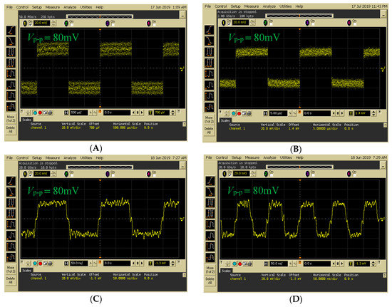 Figure 11 presents the decoding results of changing frequencies when data were transmitted from Encoder 1. A digital OSC was used to access the transmitted signal from Encoder 1. In Figure 11A–D, input frequencies of 0.5, 50, 5000, and 10,000 kHz were used as inputs for FBG Encoder 1. Compared with previous systems [21], the novel FSO communication system with the proposed Bi-OCDMA scheme was implemented successfully and further enhanced the overall transmission rate.