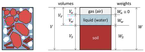 Looking at the scale of a soil element, by being a porous material, this is intrinsically multiphase. Typically, three distinct phases are recognized: solid (mineral particles), liquid (usually water), and gas. In the framework of soil mechanics, the relationships among the soil phases are schematically represented in Figure 1, which facilitates the definition of the phase relationships. Although the quantities plotted in the figure and their relationships are very well established in the fields of soil mechanics, for the sake of completeness it is only the case to recall the definitions of the main quantities addressed in this paper. With regard to volume-relationships, porosity, voids ratio, degree of saturation, and volumetric water content, they are defined as follows. By considering a soil element, porosity (n) is the ratio of voids (pores) volume to total volume, while the voids ratio (e) is the ratio of voids volume to solid volume. The degree of saturation (Sr) is defined as the percentage of the voids volume filled with water (Sr = 0 for a dry soil; Sr = 1 for a saturated soil; Sr < 1 for a partially saturated soil). On the other hand, the most useful relationship between phases in terms of weights is the gravimetric water content of a soil element: in geotechnics and soil science it is defined as the weight of water divided by the weight of solid.