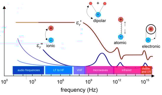A number of lossy dielectric mechanisms contribute to the global permittivity, being that the ionic and the rotational dipolar effects the most significant ones (see Figure 2). For increasing frequency only, the fast mechanisms survive. Every cutoff frequency is characterized by a sudden decrease of and a peak of .