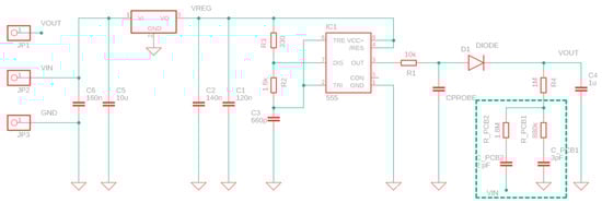To the best of our knowledge, a data sheet for this type of sensors is only available for version 1.0 [37], manufactured by DFROBOT and advertised with the name SKU:SEN0193. The only significant specifications given in the datasheet are a power supply between 3.3 and 5.5 V, output voltage between 0 and 3 V, and the recommended depth in soil. A detailed analysis of the electrical circuits of the sensor was initially accomplished in order to get acquainted on how the sensor operates (Figure 4).