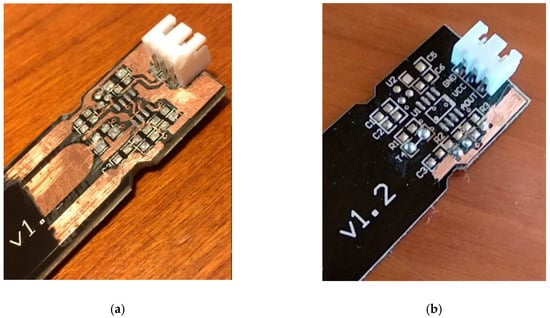 (a) Older and (b) recent soil moisture sensor v.1.2. The thin metal path to grounded capacitor plate is clearly visible only in (b).