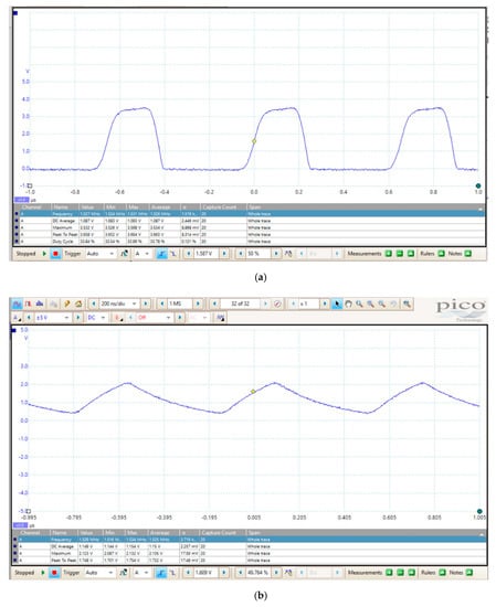 The output signal of the TL555I is a trapezoidal waveform running at about a 1.5 MHz (Figure 6a). This trapezoidal profile and the related out-of-specification duty-cycle of about 33% (the duty-cycle of a 555 should always be greater than 50%) are likely caused by the close vicinity of the operating frequency to the physical frequency limit for the TL555I device. On the other hand, it is well known that capacitive soil moisture sensors should operate at a high frequency; the higher the operating frequency, the lower the effect of losses related to the imaginary part of the permittivity. Moreover, the slew rate restraint of the waveform helps in minimizing the electromagnetic interference (EMI), which is possibly generated by the sensor in a non-ISM band and would be beneficial in case of EMI compliance test.
