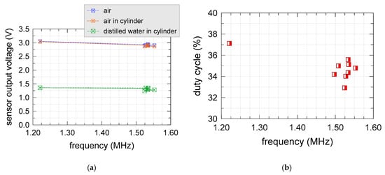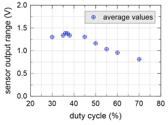 Figure 8 shows the sensor output range (difference between output voltage in air and in distilled water) as a function of duty cycle at 1.5 MHz for one of the modified sensors, driven by an external waveform generator. A square input waveform was used in this case, with a 3.3 V peak to peak voltage, slightly lower than the peak voltage of Figure 6. The peak of the output range of the sensor lays around duty cycle = 37%, which was slightly higher than the average duty cycle of the non-modified sensors.