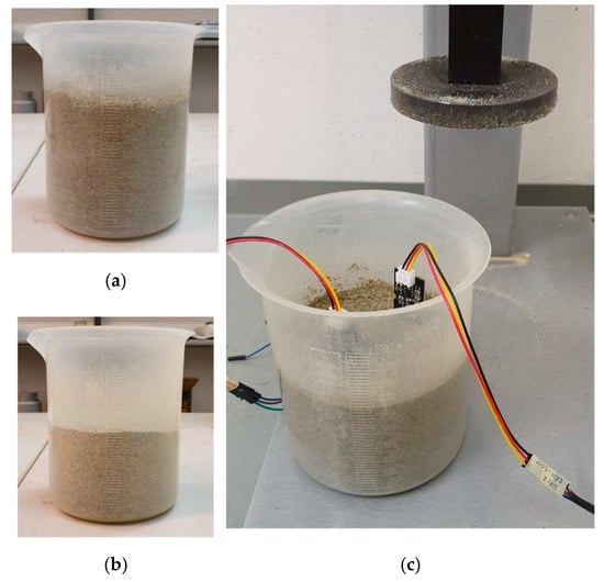 The graduated cylinder: (a) no compaction; (b) maximum compaction, soil volume is 620 mL; (c) soil volume is 680 mL with two sensors driven into.