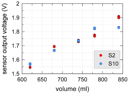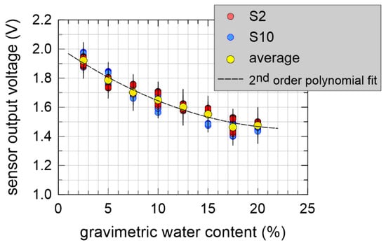 Figure 10 shows the obtained measurement results. Different colors represented the two sensors. Repeated measurements of a single sensor appeared to be very precise, with very low standard deviation (always lower than 3.3 mV). However, measurements of the two sensors differed significantly, even more than 5%. This was most likely due to the non-uniformity of the water content within the soil sample; presumably, the two sensors caught soil regions in the measurement cylinder whereas, due to a different distribution of the pores filled with water, the water content differed too.