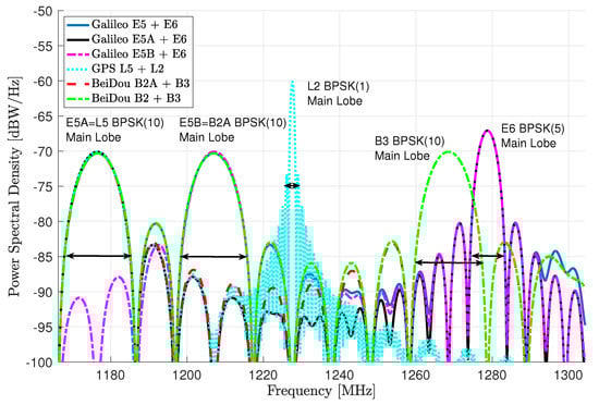 Notice that for all the signals, we only consider the corresponding pilot components, i.e., E5 is generated as E5AQ + E5BQ or the combination of E5B and E6 is generated as E5BQ + E6B. For completeness, we provide the different meta-signals power spectral density (PSD) in Figure 1, where we make explicit the individual signals main lobes: E5A, L5, E5B, B2A, and B3 signals using a BPSK(10) (i.e., a BPSK with a chip rate 10 times faster than the one of the GPS L1-C/A), E6 BPSK(5), and L2 BPSK(1) signal.