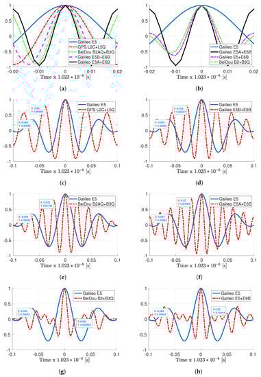 (a) Main ACF peak comparison for different meta-signals w.r.t. E5: L2C + L5, B2A + B3, E5B + E6 and E5A + E6. (b) Main ACF peak comparison for different meta-signals w.r.t. E5 and E5A + E6: Beidou B2 + B3 and Galileo E5 + E6. The comparison of each individual meta-signal ACF with the Galileo E5 is given in the remaining subplots. (c) GPS L2C + L5Q, (d) Galileo E5B + E6B, (e) BeiDou B2AQ + B3Q, (f) Galileo E5A + E6B, (g) BeiDou B2 + B3Q and (h) Galileo E5 + E6B. (i.e., in all plots, the vertical axis represents the normalized autocorrelation). The magnitude and position of the first secondary peak are given for completeness.
