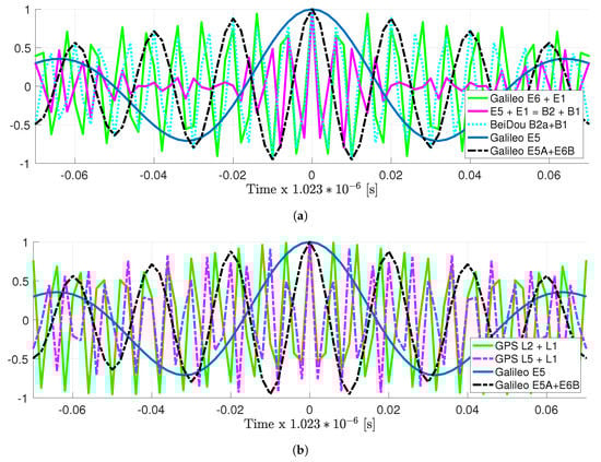 ACF for other very large bandwidth Galileo, BeiDou (a) and GPS (b) signal combinations, (i.e., in both plots, the vertical axis represents the normalized autocorrelation). For comparison the Galileo E5 ACF and the Galileo E5A + E6 meta-signal ACF are also shown.