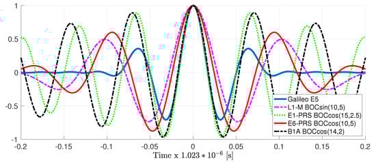The corresponding ACF for these four signals is depicted in Figure 4 and compared to the Galileo E5 ACF. Notice that the ACF shape of the E1-PRS BOCcos(15,2.5) and B1A BOCcos(14,2) is very similar to the one for the Galileo E5; therefore, we can expect a similar achievable performance (i.e., CRB and asymptotic MLE performance). In terms of the MLE behavior, these two signals have much larger ACF secondary peaks, which will certainly have an impact on the MLE convergence, as will be discussed in the results. Regarding the L1-M and E6-PRS, the ACF shape is also similar, with a slightly wider main peak w.r.t. Galileo E5 and secondary peaks that are larger, but further apart. Therefore, one can expect the convergence not to be degraded and a slightly worse achievable performance compared to the Galileo E5.