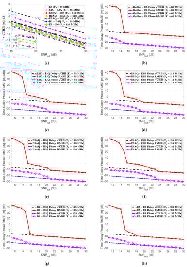 The comparison of the different time-delay CRBs (m) is shown in Subplot (a). Time-delay and phase RMSE (m) and the corresponding CRBs (m) for the different GNSS meta-signals are shown in Subplots (b) Galileo E5, (c) GPS L2C + L5Q, (d) Galileo E5B + E6B, (e) BeiDou B2AQ + B3Q, (f) Galileo E5A + E6B, (g) BeiDou B2 + B3Q and (h) Galileo E5 + E6B.