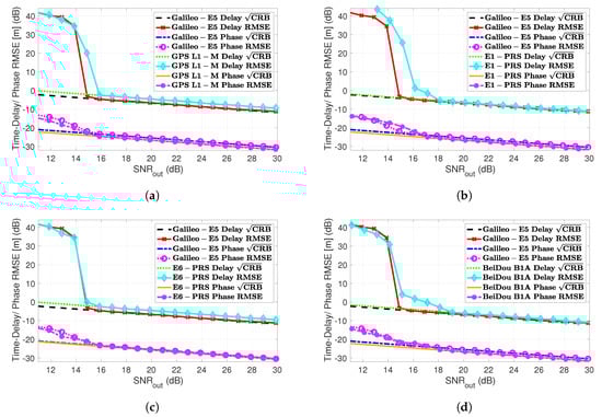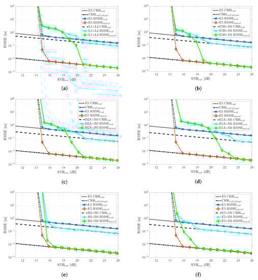 - For high SNR regimes (i.e., SNR dB), we could see the impact of the time-delay precision, which allowed RMSE < RMSE. This was clear looking at the E5A + E6 and B2A + B3 signals, which provided the lowest CRBs (see Figure 8a). However, in any case, the performance improvement was not worth the estimator behavior at lower SNRs.
