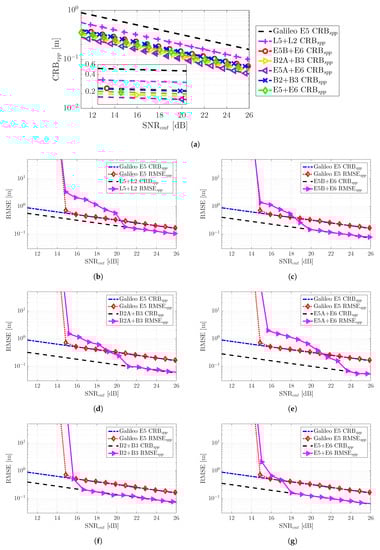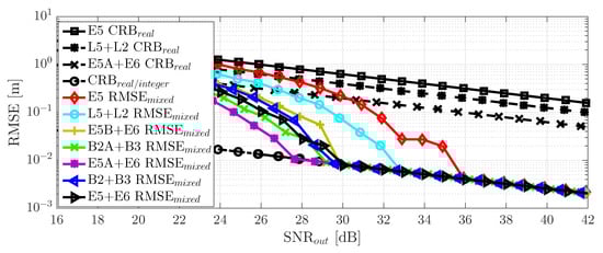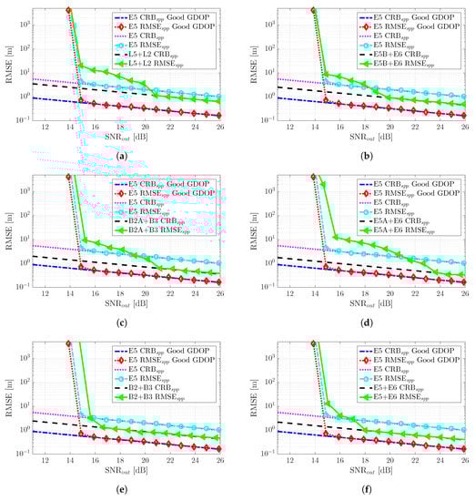 To conclude the meta-signal-based RTK positioning performance analysis, it was interesting to assess which was the convergence point of the different meta-signals in a bad GDOP scenario; in other words, when RMSE = CRB and, thus, the method correctly exploited the phase information. This result is shown in Figure 13, where the most remarkable point was that the convergence of the MLE to CRB was driven by the time-delay estimation precision. A lower CRB (i.e., better time-delay estimation precision) implied a faster convergence to CRB (i.e., the threshold region at a lower SNR). In this case, the threshold was in the range SNR dB, the best case obtained with E5A + E6 and the worst one by Galileo E5, which provided the best performance under nominal conditions.