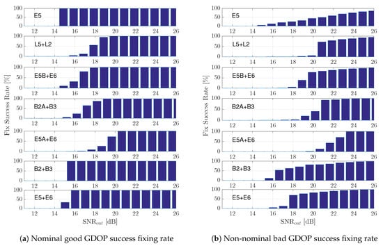 Figure 11. Nominal (a) and non-nominal (b)—good and bad GDOP, respectively—scenario RTK fixing success rate.