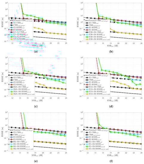 Non-nominal bad GDOP scenario RTK RMSE (m) and the corresponding CRBs (m) for the different GNSS meta-signals: (a) GPS L2C + L5Q, (b) Galileo E5B + E6B, (c) BeiDou B2AQ + B3Q, (d) Galileo E5A + E6B, (e) BeiDou B2 + B3Q and (f) Galileo E5 + E6B.