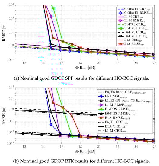 - In the RTK positioning case, CRB, which mainly depended on the carrier signal wavelength , was slightly better for the HO-BOC signals, which operated at a higher frequency in the L1/E1/B1 band. Under nominal conditions, this implied that the carrier phase-based solution was improved by the L1-M and E6-PRS signals, because they preserved the same threshold behavior. In contrast, as for the SPP case, the threshold for the E6-PRS and B1A signals was degraded [1–2] dB.