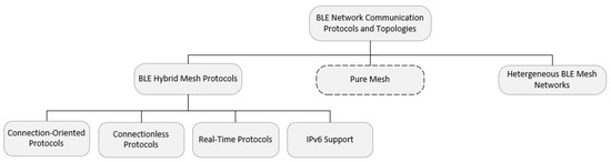 The vast majority of BLE-based applications still assume a star network topology while using BLE Beacons in broadcast mode [3,4,5,6,7,8,9]. To enhance the coverage of BLE 4 networks, hybrid mesh topologies extend the master-slave piconet concept into various interconnected scatternets via the fusion of star and mesh links [10]. Nonetheless, reliability and scalability remain an issue. In contrast, a pure mesh topology removes the master–slave limitation by making nodes peer with each other to form scalable networks. Nonetheless, there is a lack of research on the implementation of BLE 5 pure mesh topologies to date. In addition, the proposed protocols lack multicasting and topology auto-configuration capabilities [11].