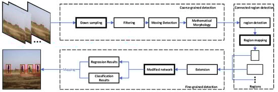 In this section, the improvements made to our previously developed framework for moving object detection are discussed. Figure 1 illustrates the modules of the improved framework developed in this paper. The modifications are highlighted with bold boxes. Let us begin with the coarse-grained detection block or stage, which consists of moving object detection with downsampling together with low-pass filtering and morphology filtering (opening operation). Then, adjustments are made to the framework in [] to obtain connected region detection by mapping the coordinates of moving regions to the original image. In addition, in order to obtain more complete moving regions, the regions are extended. After cropping, the regions obtained in the coarse-grained detection stage are fed into a modified network to enable fine-grained detection. As moving objects are initially detected in the coarse-grained detection stage, in the fine-grained detection stage, objects occupy larger areas in the regions. Hence, the input size of the deep neural network becomes 320 × 320, or smaller than the size 416 × 416 used in YOLOV3 [].