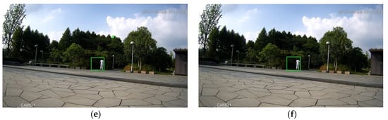 As an example of the effectiveness of downsampling, Figure 2 illustrates the outcome of the coarse-grained detection stage consisting of moving object detection with low-pass filtering and morphology filtering (the left column), as well as the outcome with downsampling (the right column). From this figure, it can be observed that the coarse-grained detection with downsampling is comparable. This observation is further supported by the outcome shown in Figure 3, which is the output of the entire framework with downsampling, Mobilenet backbone and focal loss mentioned in Section 4.2.