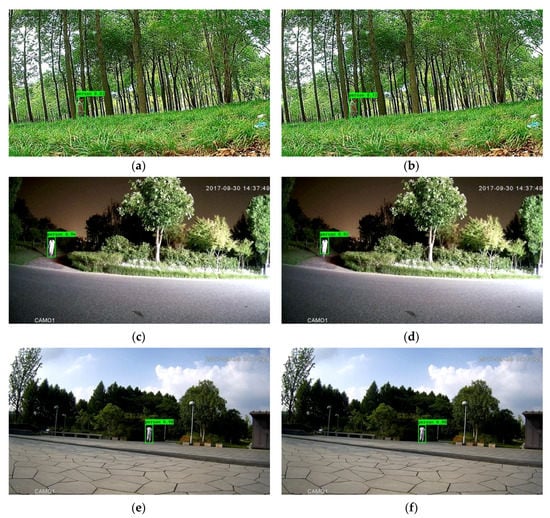 Outcomes of the framework with 416 × 416 input size without downsampling (a,c,e) and with downsampling (b,d,f). The left column and right column correspond to the same images.