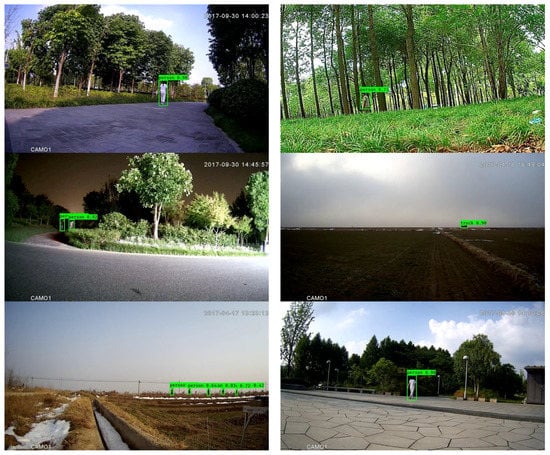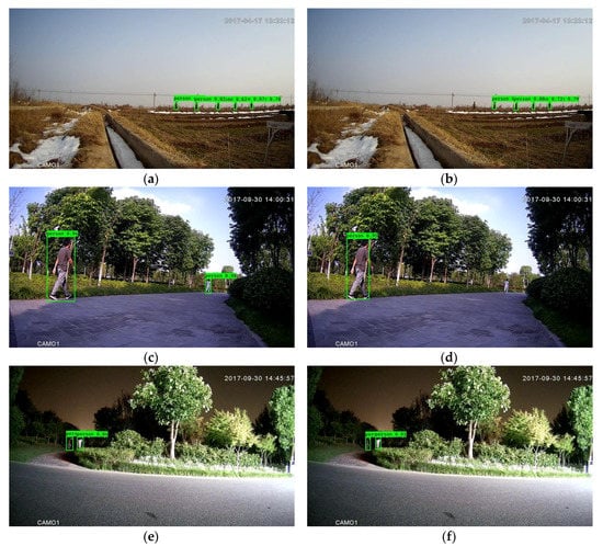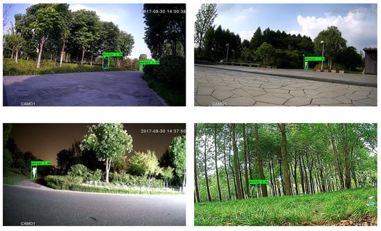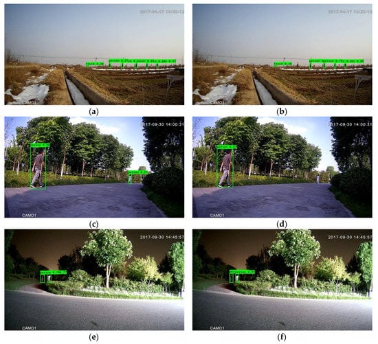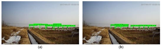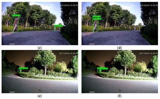 In order to obtain higher computational efficiency, downsampling was employed in the framework with Mobilenet-YOLOV3. As shown in Table 4, compared with the modified framework without downsampling, it can be observed that the modified framework with downsampling obtained approximately 1.40 times speedup. In addition, as shown in Table 3 and Table 4, the modified framework outperformed the original framework with MTiny YOLOV3 in terms of accuracy, 4.12% higher with similar execution time. The importance of the framework with a light backbone and downsampling is in conducting real-time detection with favorable accuracy. Furthermore, from a qualitative perspective, Figure 4 illustrates the effectiveness of the modified framework with Mobilenet-YOLOV3 and downsampling.
