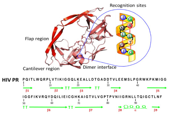 Viruses are the most dangerous threat to human health nowadays. Acquired immunodeficiency syndrome (AIDS) is one of the most severe illness caused by the human immunodeficiency virus (HIV) [10]. HIV protease (HIV PR) is a virus-specific aspartic PR responsible for the proteolytic maturation of the polyproteins of gag and gag-pol during virion maturation and for the proliferation of the retrovirus [11,12]. HIV PR is also a dimer of two 99-amino acid monomer subunits [13]. The terminal domain of each subunit is made up of β-sheets 1–4 and 95–99 in each monomer, the random coil residues 4–9, and the α-helix residues 85–94 in each monomer [14,15]. Gly86-Arg87-Asn88 in the α-helix is unique on the surface of retroviral PR [16], corresponding to an effective neutralizing antibody [14,15,16]. Since virion maturation is essential for viral infectivity, HIV PR is an excellent target for drug therapy because the interference with PR activity blocks the maturation of the virus, preventing both virus replication and the further infection of host cells [12]. Therefore, the rational design of a preventive PR inhibitor requires to understand the antibody–epitope interaction for antiretroviral therapies specific to HIV/AIDS [17,18].