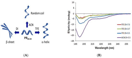 (A) Effects of organic solvents on protein secondary structure and function. (B) Circular dichroism (CD) spectra of the HIV PR85–94 peptides and their respective complexes on selective solvents. TFE, 2,2,2-trifluorethanol; DI, deionized water; ACN, acetonitrile.