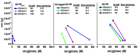 We then tested the MIPs-grafted 10-mer peptide chips for their affinity in order to differentiate between molecular binders of the template and their mother proteins. We observed the mass change for the HIV PR85–94 peptides, the His-tagged HIV PR, and the HIV PR solution at various aqueous mixtures of solutions (0.01, 0.1, and 1 ng/mL) on the HEMIPs-QCM sensor at different ratios of the aqueous mixture solution (TFE/ACN/DI water). The Kd value was obtained from the last two spots linear response of mass shifts and template concentrations [30,31]. They are used to evaluate the maximal capacities of HEMIPs-QCM chips as well as their binding affinities. The Kd value of our resultant HIV PR85–94 QCM chip relative to HIV PR85–94 itself was calculated to be 160, 1620 and 1180 pM, and Bmax was 9.75, 7.43 and 13.2 pmole/mg for TFE:DI = 7:3, TFE:DI = 3:7, and ACN:DI = 5:5; we observed 43.3, 180 and 140 pM for His-tagged HIV PR (11.9 kDa Mw), and 26.8, 31.2 and 39.2 pmole/mg for Bmax; and we observed 78.5, 86.8 and 100 pM for HIV PR, and 35.4, 35.3 and 48.8 pmole/mg for Bmax (Figure 3).
