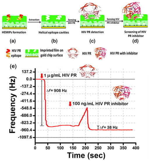 Schematic illustration of (a) the formation of helical epitope-mediated molecularly imprinted polymers (HEMIPs), (b) removal of the template molecules, (c) detection of HIV PR, (d) detection of the HIV PR inhibitor using HEMIPs on QCM chips, and (e) the response profile for the consecutive binding of the HIV PR and the HIV PR inhibitor to the HEMIPs-QCM chip.