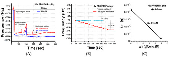 The screening of the HIV PR inhibitor (nelfinavir) on the imprinted film was studied via the HIV PR/HEMIPs chip (Figure 5A). At first, 1 μg/mL HIV PR solutions were injected into the HEMIPs-QCM chip (arrow 1 at the blue and red lines), the frequency changes of the chips were monitored. Upon saturation, nelfinavir was injected (arrow 2 at the blue and red lines) at a concentration of 100 ng/mL until reaching equilibrium. Based on the platform of helical epitope imprinting, the complexation of the HIV PR/HEMIPs chip with nelfinavir resulted in an approximately 40 Hz or 50 Hz frequency shift, respectively. To determine the test–retest repeatability and interplatform reproducibility, an acetic acid solution was used to remove the remnants of the reactants on the HIV PR/HEMIPs chip (Figure 5A). Thus, 0.5% (arrow 3 at the blue line) or 0.8% (arrow 3 at the red line) acetic acid solution was tested to remove the nelfinavir on the HIV PR/HEMIPs chip. No nelfinavir release was observed for 0.5% acetic acid solution (blue line), while washing with 0.8% acetic acid solution (red line) released the nelfinavir from the HIV PR/HEMIPs chip until it reached the former baseline level. The results indicated that the 0.8% acetic acid (arrow 3 at red line) displayed higher extraction recoveries for nelfinavir without releasing HIV PR. The reuse of the HIV PR/HEMIPs chip can be operated for the binding and unbinding of nelfinavir in nelfinavir/HIV PR/HEMIPs assay. Therefore, after a short wash with a 0.8% acetic acid solution, bound nelfinavir was completely removed from the surface of the HIV PR/HEMIPs chip. Obvious differences in the binding baseline restoration were noted in the 0.8% acetic acid solution-treated chip when compared to the 0.5% acetic acid solution-treated chip. Reuse of the HIV PR/HEMIPs chip with 1 ng/mL or 100 ng/mL of nelfinavir was able to regenerate the “sandwich” layers for recapturing and detecting nelfinavir again (Figure 5B). High reusability performance can be attended to observe the same recognition signals. The inhibition constant Ki of the nelfinavir inhibitor [34] relative to HIV PR/HEMIPs chip was determined to be 1.99 nM (Figure 5C), indicating that the affinity of nelfinavir to the HIV PR/HEMIPs chip was strong enough to be used as an anchoring inhibitor. The presence of detergent can wash away the binding materials out of the background levels, without the dissociation of HIV PR from HEMIPs chip. Moreover, the concentration of nelfinavir can be determined at a clinically relevant concentration ranging from 1 ng/mL to 100 ng/mL; thus, proving this assay is suitable for screening the level of nelfinavir in clinical samples.