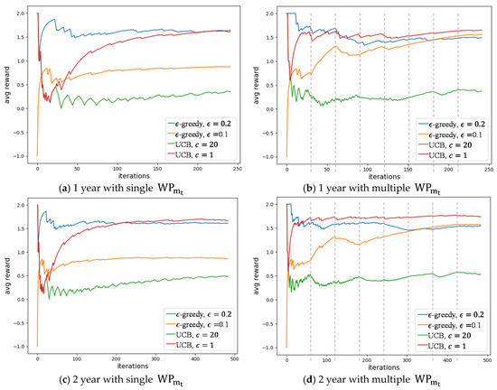 The eight contexts were equally distributed in a sequential manner in the time window; they are identified by dashed gray lines in Figure 6b,d,f,h. The UCB method with was also the best method for multiple contexts, an average reward of 1.653 in one year and 1.788 in five years. However, using a single year the results from the different methods were very close with the following average rewards: 1.653 for the UCB method with , 0.376 for the UCB method with , 1.562 for the -greedy method with , and 1.492 for the -greedy method with . It was in the three-year execution that the UCB method with showed a significant improvement. At the end of five years, the UCB method with was able to achieve an average reward of 1.788. This means that at the end of five years, the UCB method with had a better reward average for multiple contexts. For multiple contexts, the -greedy method also showed quality results, achieving average rewards of 1.481 and 1.483, for and , respectively. Despite presenting an average lower than the UCB method with , the -greedy method with was the only method with an uphill trajectory at the end of the fifth year.