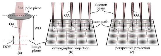In contrast to the common perspective camera, the camera center of the affine camera lies at infinity resulting in parallel projection rays. This has the effect that images are not altered when an object is translated parallel to the optical axis which means that the projection of an ideal affine camera is not scaled by the individual depth of the object points. These projection properties cause ambiguities in the case of motion recovery that can only be uniquely solved when three or more views of a scene are available [,]. The theory of these effects was deeply studied in the early works of computer vision. Nowadays, it finds its application in several disciplines like modelling imaging systems that use telecentric lenses [], pushbroom cameras that provide satellite images [] or in this scenario the SEM’s imaging system. Although all these systems do not fully comply with an ideal affine projection, its application is especially suitable when the depth relief of the scene is small compared to its average depth and when the distance of a considered point to the optical axis is small. The fact that the SEM’s working distance is usually much larger than the distances defined by the dimensions of the imaged scene causes the electron beam to be nearly parallel on every position of the raster scan pattern. In Figure 2b, the electron beams for an ideal orthographic projection and in Figure 2c, for a projection with remaining perspective effects are schematically illustrated. For a small field of view as well as high ratios between the working distance and depth variation of the scanned area, these perspective effects diminish.