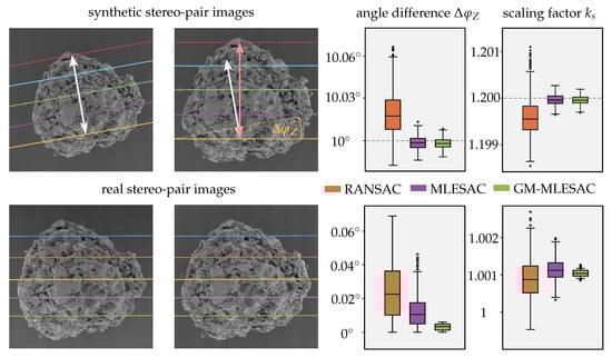 This factor directly corresponds to the ratio of the distances between the epipolar lines in the two images. In Figure 5 the different scaling of the distances between the epipolar lines is illustrated for a synthetic and a real stereo-pair of a gravel particle. The affine epipolar geometry was used to compute the angle difference of the two epipolar line slopes and the relative scaling factor . The performance of the robust estimation schemes is illustrated and shows that MLESAC produces less scattered data based on the results of 1000 runs in comparison to RANSAC. The obtained results for the synthetic images are close to the true values. For the real images the ground truth is unknown because the adjustment of the scan rotation and the tilting of the stage are afflicted with uncertainties. The GM and computation of over all inliers allows to tighten up the result’s distribution. Probably due to the noise and the higher corruption of minimal configuration sets, this effect is more pronounced for the real images. The alteration of the scaling factor for the eucentric tilt is very small and lies only at about . This scaling change between different views of an image sequence is caused by the alterations of the specimen’s position along the Z-axis due to the tilting process. Nevertheless, these very small deviations to a constant value of 1 could still be caused by the noise in the point correspondences. In the following sections, it will be further evaluated if the consideration of scaling changes in this reconstruction routine is beneficial and how it varies in its magnitude for other image pairs and sequences.