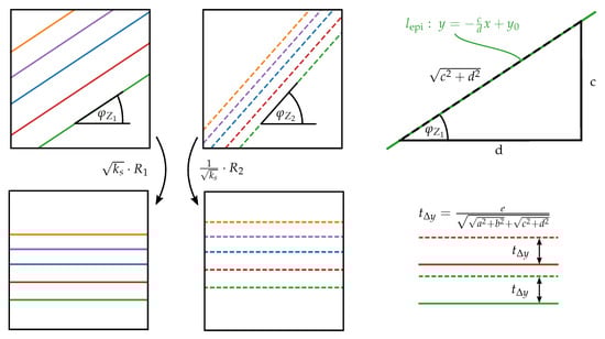 Unrectified epipolar lines for an affine projection with the slope angles and . Applying the rotations , and the scaling adjustment results in horizontal and evenly spaced epipolar lines. Finally, the translational offset can be compensated. In the top right, the definition of an epipolar line is given and the triangle that allows to define the rotation matrices of Equation (12).