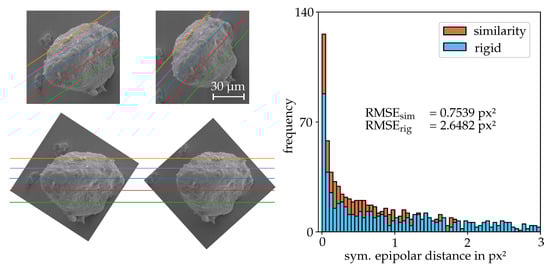 (left) Unrectified and rectified stereo-pair using the similarity transform for the images of a DEP agglomerate (DEP II). (right) Post rectification errors computed for the two different methods in terms of the symmetrical epipolar distances using for 463 matches.